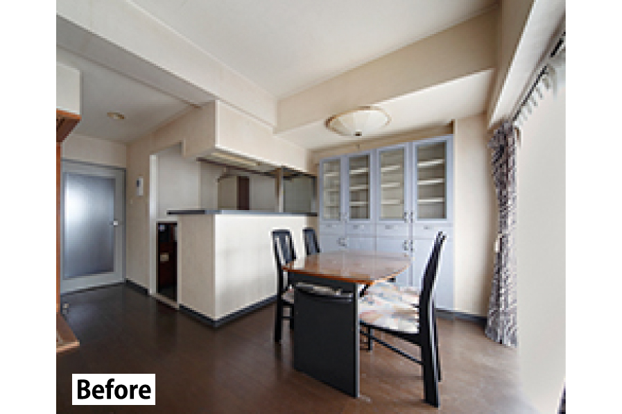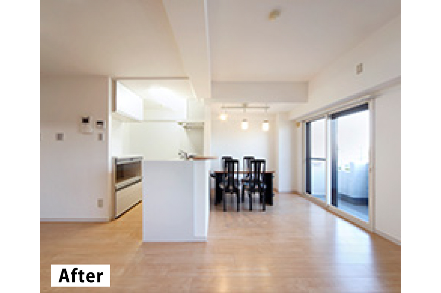 ご両親様と幼少期に住んでいたマンションを息子様の子世帯が新しく住み継ぐためのリフォームです。基本的な間取りの変更はありませんが、以前と比べると空間のゆとり暖かみ明るさが違うように感じますね。古くなった設備や内装を一新させキッチン周り拡張し使いやすく充実させています。