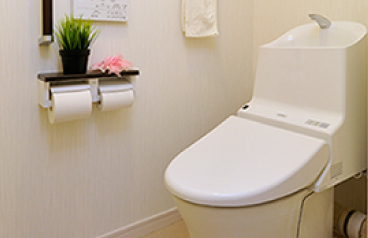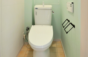 窓から差し込む陽の光と黄色の壁紙で明るいトイレに