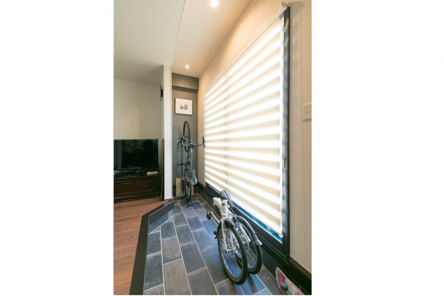 カーポートとつながる大きな窓に合わせて土間スペースの天井を高くし、家に入った時の開放感を重視。土間を広く見せるため、上がり框の下に靴が収納できるよう工夫しました。また、飾られた絵を照らすダウンライトも設置。居心地の良い空間が作れました。