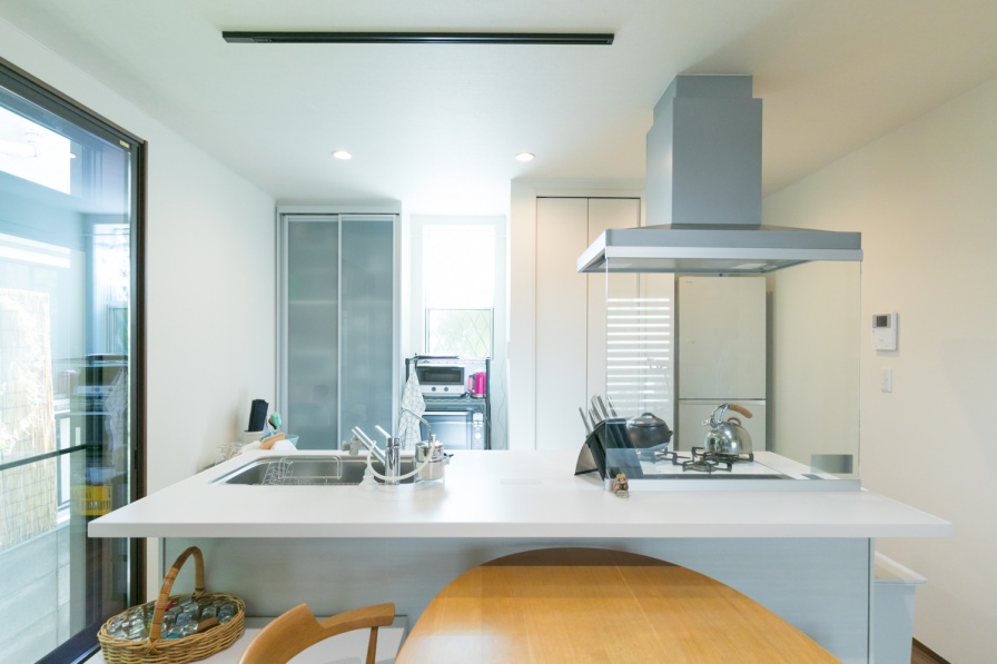 作業中でもぶつからないように、左右どちらからでもリビングに行き来できるアイランドキッチンを採用。仏間だった空間を収納スペースとし、明るさと風通しを確保するために新しく窓を付けました。