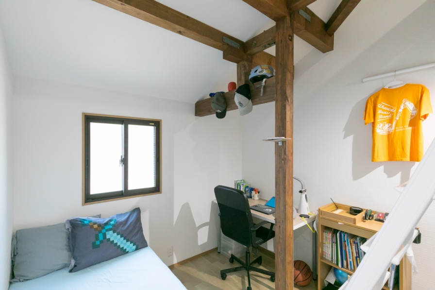2階にある3畳の納戸を広げ、息子の部屋に。希望だった木の柱を見せ、ロフトを設置するなど遊び心満載の部屋になりました。