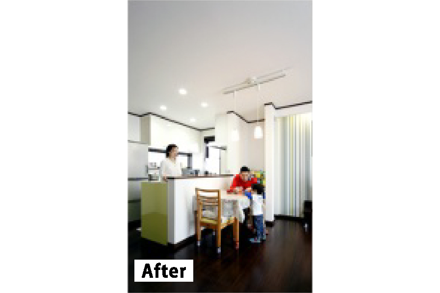 ストライプのアクセントクロスが目を引く爽やかな印象のLDK空間。2世帯で住む、家族がのびのびと暮らせる快適な空間として生まれ変わりました。お施主様(ご主人様)より、「リフォームをして、妻が一番喜んでる姿を見るのが、私はうれしいんです。」とのコメント。家族のためのおもいやりのリフォーム実例ですね。