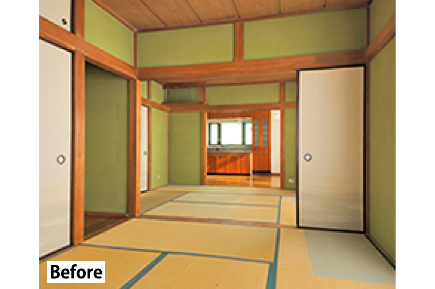既存のダイニングキッチンと2つある和室のうち1つを一体化。
