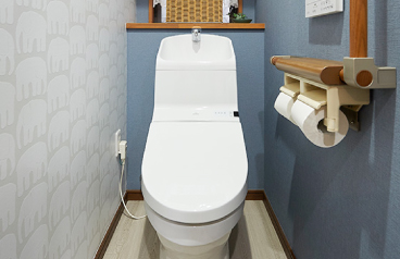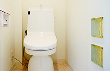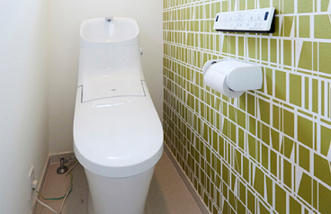 窓から差し込む陽の光と黄色の壁紙で明るいトイレに