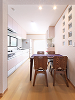 キッチン室とダイニング空間が一緒になった間取り。テーブルの横は玄関ホールとつながる扉があった所。実際には使われていなかったため、塞いでしまいガラスブロックを並べて空間のアクセントにしたのがポイントです。※参考価格にはキッチン設備費は含まれていません。