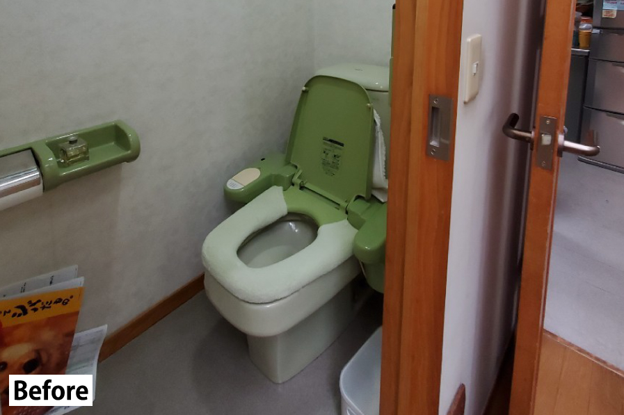 位置を移動し介護がしやすい広さも確保。トイレから洗面所にも移動できるように回遊型の間取りにし、車いすやイスに座って身支度ができる洗面化粧台をご提案。