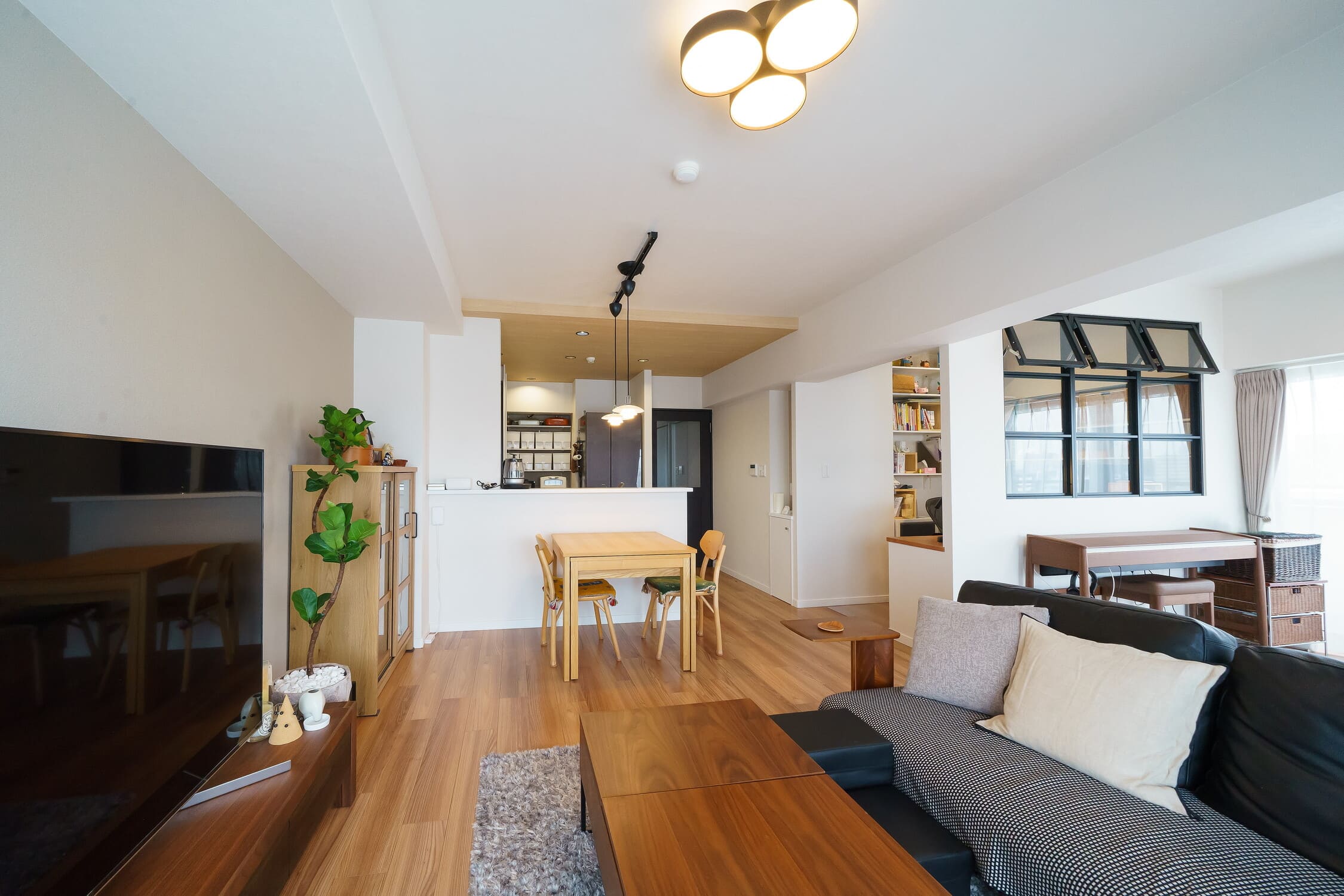 U様は3階建て戸建てからマンションへの住み替えを機にリフォームを実施。物件探しからリフォーム担当者が同行し、配線や構造など希望のプランが実現できる物件を厳選して購入されています。 ご家族の希望は「集中できるワークスペース」「愛犬に優しい家」「モノトーン×ナチュラルの内装」。 2LDKを1LDKに変更して風通しを良くし、こだわりの書斎には室内窓(デコマド)を採用して開放感を確保。玄関の壁を一部解体して広げたり、愛犬のために床のレールをなくす吊り戸を採用するなど、事前の情報収集で固めた理想のイメージを忠実に再現しました。 HOUSE DATA リフォーム面積:66.16㎡ 建物:マンション 工期:64日 築年数:35年
